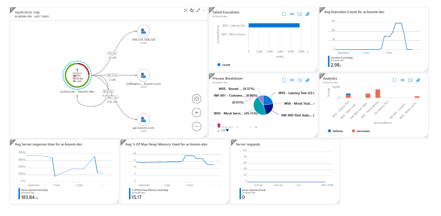 When used in conjunction with Azure Monitor for VMs, you can end up with full observability of the entire Boomi runtime, with the ability to build dashboards, run queries and send alerts.