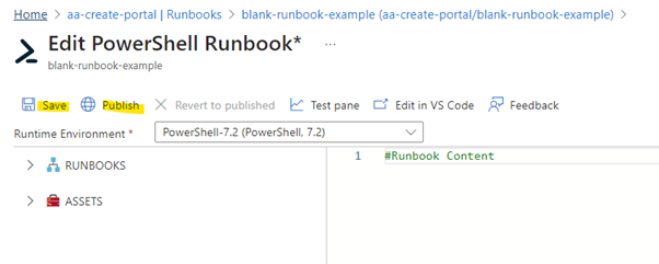 You will then be navigated to the created runbook – You can enter the runbook script content. Note the save and publish buttons. Save will save the runbook as a draft which can be returned to later. Publish will publish the runbook so it will be executed.