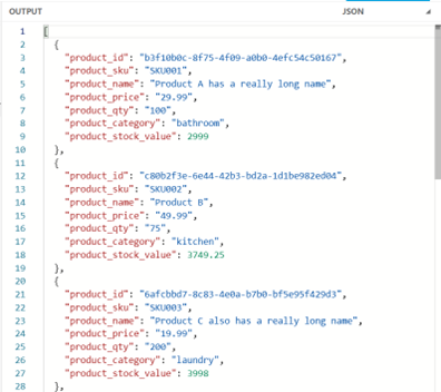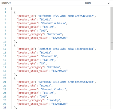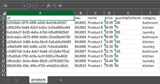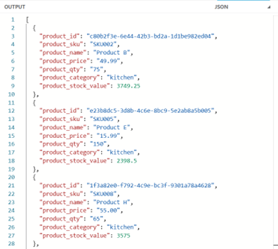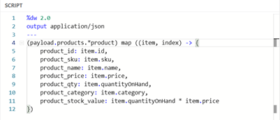 For our examples below, let’s assume that the input payload is a collection of Products that each have an ID, SKU, Name, Price, Quantity on Hand, and Category.