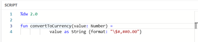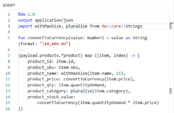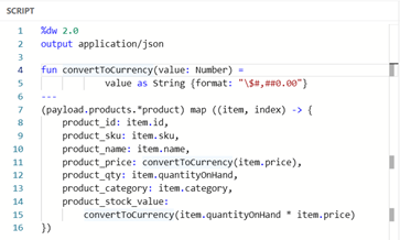 One more time back to our Products example. This time, we want to convert the value fields to a formatted currency String. To do this, we will create a function convertToCurrency in the header, and then pass the relevant values into this function within our mapping.