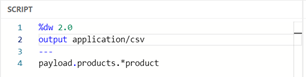 As you can see though, the output isn’t a JSON array as we may have wanted but instead is a JSON object. All we require is a simple tweak to the DataWeave to tell it we want to pull out all the “product” nodes into an array.